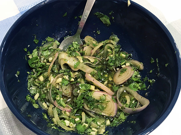 - Mezclar todos los ingredientes en un bol y aderezar con un chorro generoso de aceite de oliva virgen extra, una cucharada de vinagre de vino tinto, pimienta negra molida, cayena molida y sal.