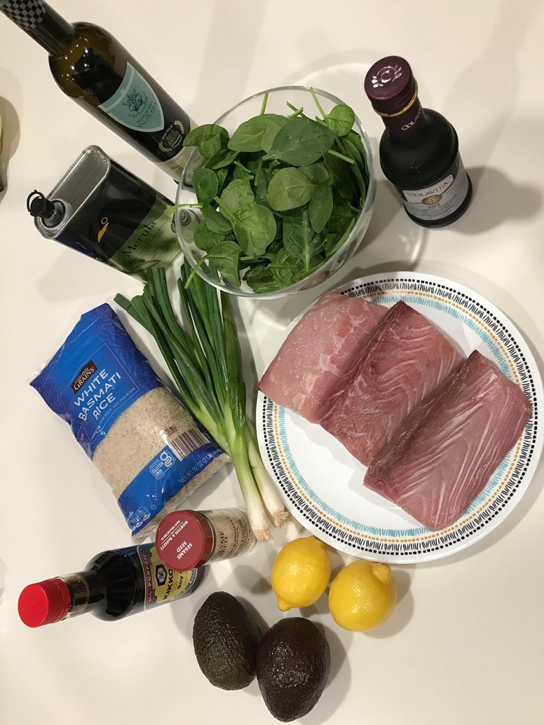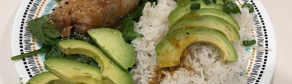 - Montaje del plato: En el plato, coloca una cama de arroz basmati al lado de las espinacas, el pescado sobre las espinacas y las láminas de aguacate sobre el arroz. Vierte el jugo de la sartén sobre el aguacate y el arroz. No olvides los ajos. Termina con la cebolleta picada por encima.