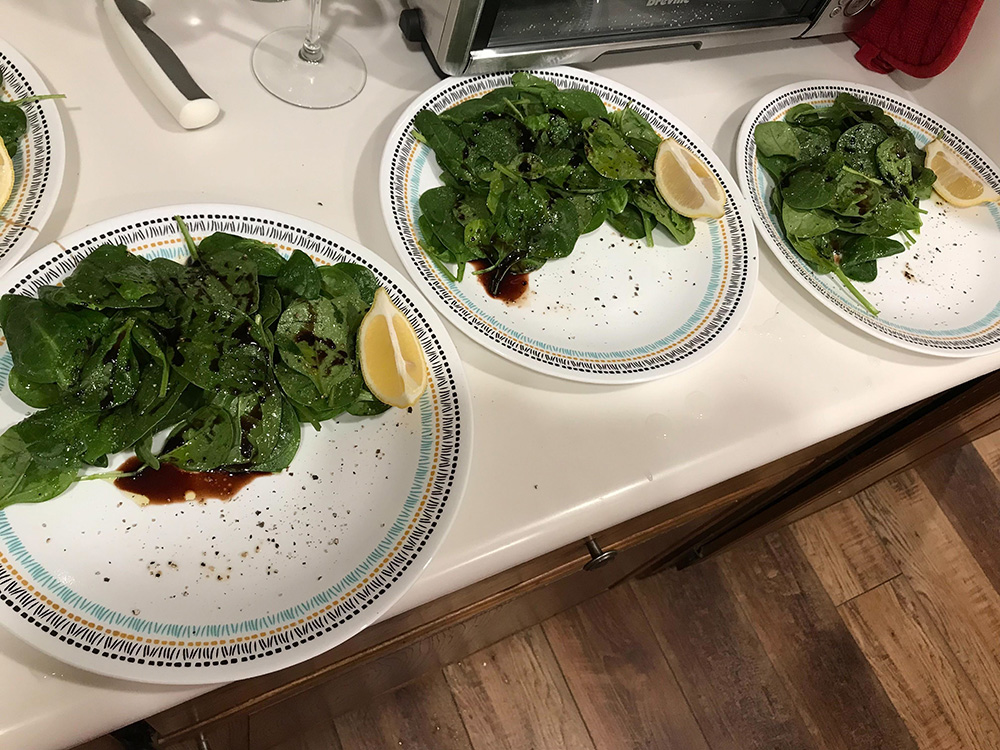 - Base de espinacas: Lava las espinacas y colócalas en un lado del plato de servir. Rocía con aceite de oliva, vinagre balsámico, sal y pimienta al gusto.
