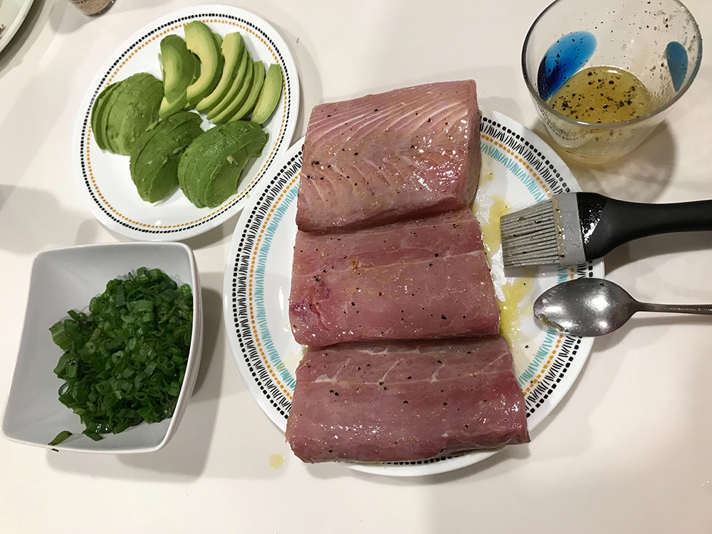 - Emulsión de aceite y limón para el pescado: Mezcla en un vaso aceite de oliva, jugo del otro limón, sal y pimienta. Con ayuda de una brocha, unta la emulsión en ambos lados del Mahi-Mahi y espolvorea con semillas de sésamo.