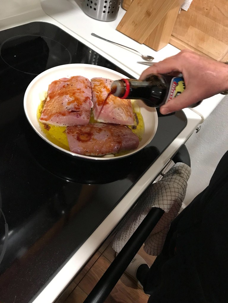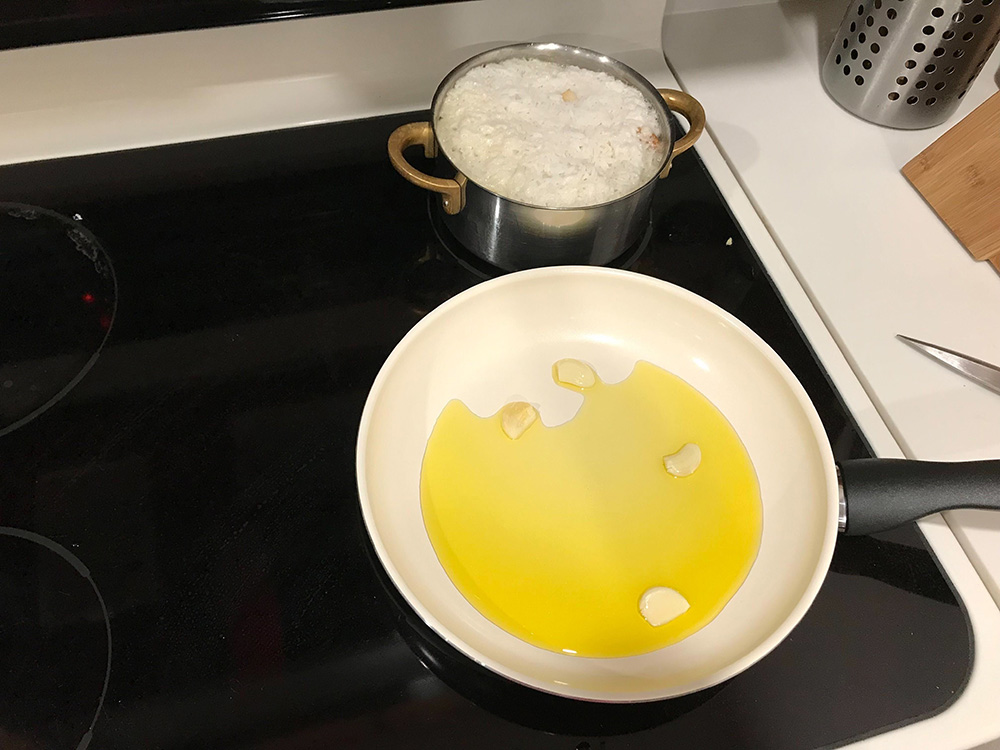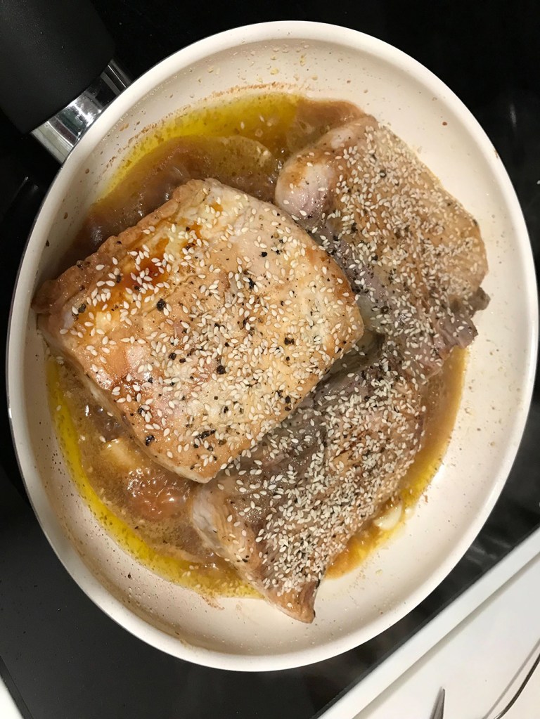 - Cocción del pescado: Diez minutos antes de finalizar la cocción del arroz, calienta aceite de oliva en una sartén con los dientes de ajo restantes. Cocina el pescado a fuego medio-bajo, dándole la vuelta cuando un lado esté cocido. Añade más emulsión, un chorrito de aceite de soja y semillas de sésamo en ambos lados. Tapa la sartén para mantener la jugosidad del pescado.